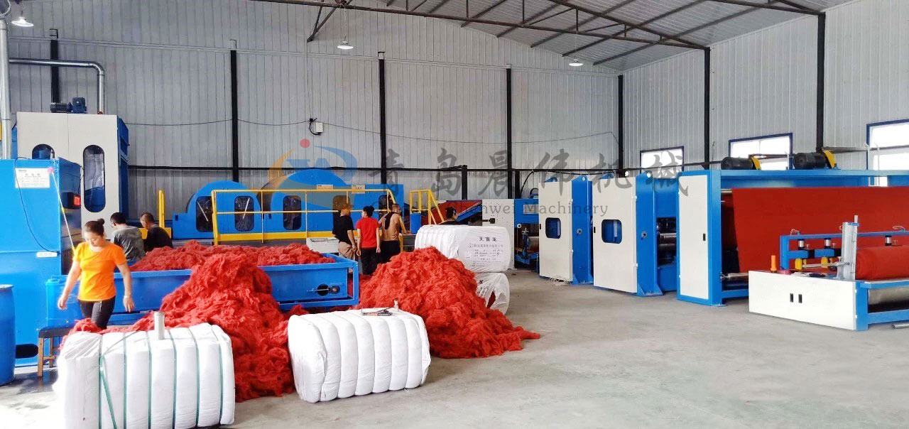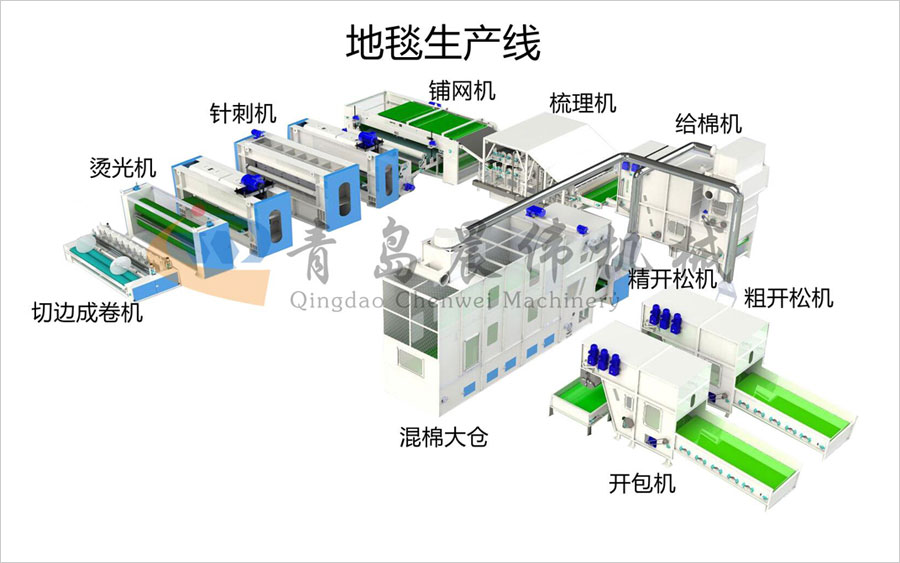 開包機(jī)-開松機(jī)-振動(dòng)給棉機(jī)-梳理機(jī)-鋪網(wǎng)機(jī)-針刺機(jī)-切邊成卷機(jī)