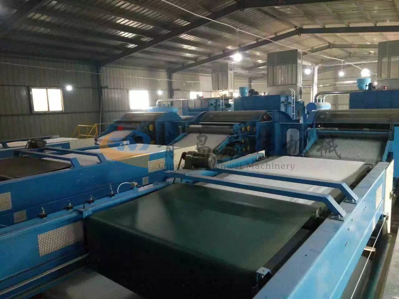 5. CWPW-鋪網(wǎng)機(jī):用于將梳理纖網(wǎng)通過移動小車交叉折疊為所需幅寬和定量的多層纖網(wǎng),以供后道工序使用。鋪網(wǎng)輥采用特殊結(jié)構(gòu),加裝壓網(wǎng)輥和導(dǎo)流板,不飄網(wǎng)不起皺,五只大功率電機(jī)精確控制各部件的運動,電動輸出簾高度調(diào)節(jié)裝置。